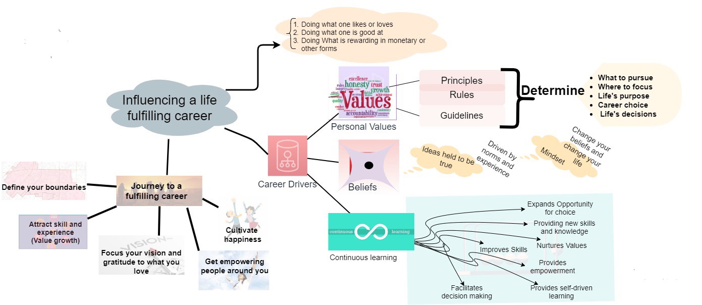 1. Influencing a life-fullfilling Career mind map 2. Self awareness Mind Map 3. Continuous learning Mind Map 4. Attitude Mind Map 5. Value and use of time Mnd Map 6. Building networks and relationships Mind Map 7. Self-Confidence Mind Map 8. Communication for career success Mind Map
